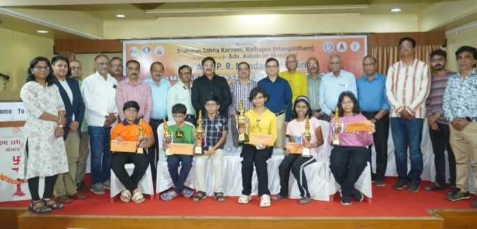 ब्राह्मण सभा करवीर मंगलधाम पुरस्कृत महाराष्ट्र राज्य तेरा वर्षाखालील मुलां मुलीच्या निवड बुद्धिबळ स्पर्धेमधून तन्मयी,चतुर्थी, मायशा, सिद्धांत, रुहान,विवान व कुशाग्र यांची राष्ट्रीय स्पर्धेसाठी निवड. कोल्हापूर (प्रतिनिधी):- ब्राह्मण सभा करवीर मंगलधाम, बिनखांबी गणेश मंदिराजवळ,कोल्हापूर येथे ॲड.पी आर मुंडरगी स्मृती एच टू ई महाराष्ट्र राज्य तेरा वर्षाखालील मुला-मुलींच्या निवड बुद्धिबळ स्पर्धा संपन्न झाल्या. या स्पर्धेच्या अंतिम आठव्या फेरीनंतर मुलांच्या गटात चौथा मानांकित पुण्याचा सिद्धांत साळुंके ने आठ पैकी साडेसात गुण मिळवून अजिंक्यपद पटकावले. दहावा मानांकित मुंबईचा रुहान माथुर ने सात गुणासह उपविजेतेपद संपादन केले. सातवा मानांकित कोल्हापूरचा विवान सोनी ने साडेसहा गुणासह तृतीय क्रमांक पटकाविला तर आठवा मानांकित नागपूरच्या कुशाग्र पालीवाल ने चौथे स्थान स्थान मिळविले . मुलींच्या गटात चौदावी मानांकित सातारची तन्मयी घाटे ने सात गुण मिळवून स्पर्धेचे अजिंक्यपद पटकाविले. दहावी मानांकित पुण्याची चतुर्थी परदेशी ने साडेसहा गुणासह उपविजेतेपद मिळविले तर अग्रमानांकित मुंबईच्या मायशा परवेज ला साडेसहा गुण मिळवून ही कमी टायब्रेक गुणामुळे तृतीय स्थानावर समाधान मानावे लागले. या सर्वांची गोवा येथे तीन ते नऊ सप्टेंबर दरम्यान होणाऱ्या तेरा वर्षाखालील राष्ट्रीय निवड बुद्धिबळ स्पर्धेसाठी महाराष्ट्र संघात निवड झाली आहे. श्री महालक्ष्मी बॅंकेचे अध्यक्ष ॲडव्होकेट रवी शिराळकर, कोल्हापूर चेंबर ऑफ कॉमर्सचे माजी अध्यक्ष व क्रीडा प्रतिष्ठान कोल्हापूरचे खजिनदार आनंद माने, युनिव्हर्सल सेक्युरिटी सर्व्हिसेस चे कॅप्टन उत्तम पाटील, ब्राह्मण सभा करवीर मंगलधाम चे अध्यक्ष डॉक्टर उदय कुलकर्णी, शाहू मॅरेथॉन व बिनखांबी गणेश मित्र मंडळाचे संस्थापक अध्यक्ष किसनबापू भोसले, कोल्हापूर जिल्हा बुद्धिबळ संघटनेचे अध्यक्ष प्राध्यापक अरुण मराठे, महालक्ष्मी बँकेचे संचालक कृष्णा काशीद, राजन देशपांडे, श्रीकांत लिमये व संतोष कडोलीकर यांच्या हस्ते स्पर्धेचे बक्षीस वितरण करण्यात आला. यावेळी व्यासपीठावर चेस असोसिएशन कोल्हापूरचे भरत चौगुले मनीष मारुलकर, धीरज वैद्य उत्कर्ष लोमटे, प्रीतम घोडके,अनिश गांधी व आरती मोदी उपस्थित होते. विजय माने यांनी कार्यक्रमाचे सूत्रसंचालन केले. या स्पर्धेसाठी मुख्य पंच म्हणून सांगलीच्या आंतरराष्ट्रीय पंच पौर्णिमा उपळावीकर यांची नियुक्ती महाराष्ट्र बुद्धिबळ संघटनेने केली होती. त्यांना मनिष मारुलकर, करण परीट,आरती मोदी, रोहित पोळ,रवींद्र निकम, प्रशांत पिसे यांनी सहाय्य केले. *इतर मुख्य बक्षीस विजेते पुढीलप्रमाणे* मुलांचा गट 5) शौनक बड