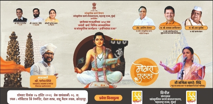 कोल्हापूर, : राज्य शासनाच्या सांस्कृतिक कार्य संचालनालयाच्या वतीने संत ज्ञानेश्वर महाराजांच्या ७५० व्या जयंती वर्षानिमित्त संपूर्ण महाराष्ट्रभर विविध सांस्कृतिक उपक्रमांची मांदियाळी सुरू आहे. याच उपक्रमाचा एक भाग म्हणून कोल्हापूरच्या रसिकांसाठी ‘मोगरा फुलला’ या विशेष सांगीतिक कार्यक्रमाचे आयोजन करण्यात आले आहे.